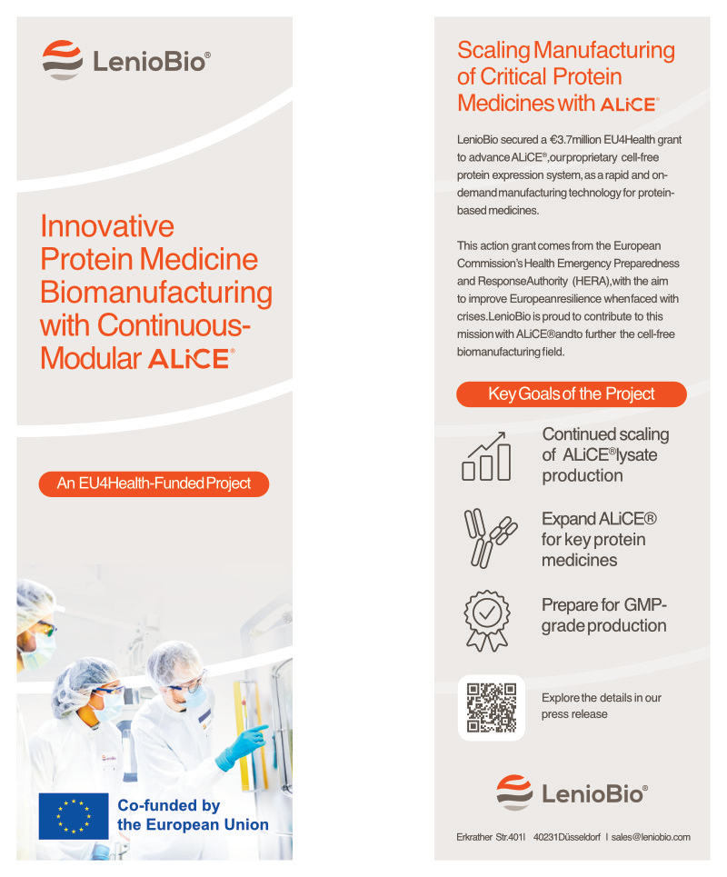 LenioBio secured a € 3.7 million EU4Health grant to advance ALiCE®, our proprietary cell-free protein expression system, as a rapid and on-demand manufacturing technology for protein-based medicines. This action grant comes from the European Commission’s Health Emergency Preparedness and Response Authority (HERA), with the aim to improve European resilience when faced with crises.